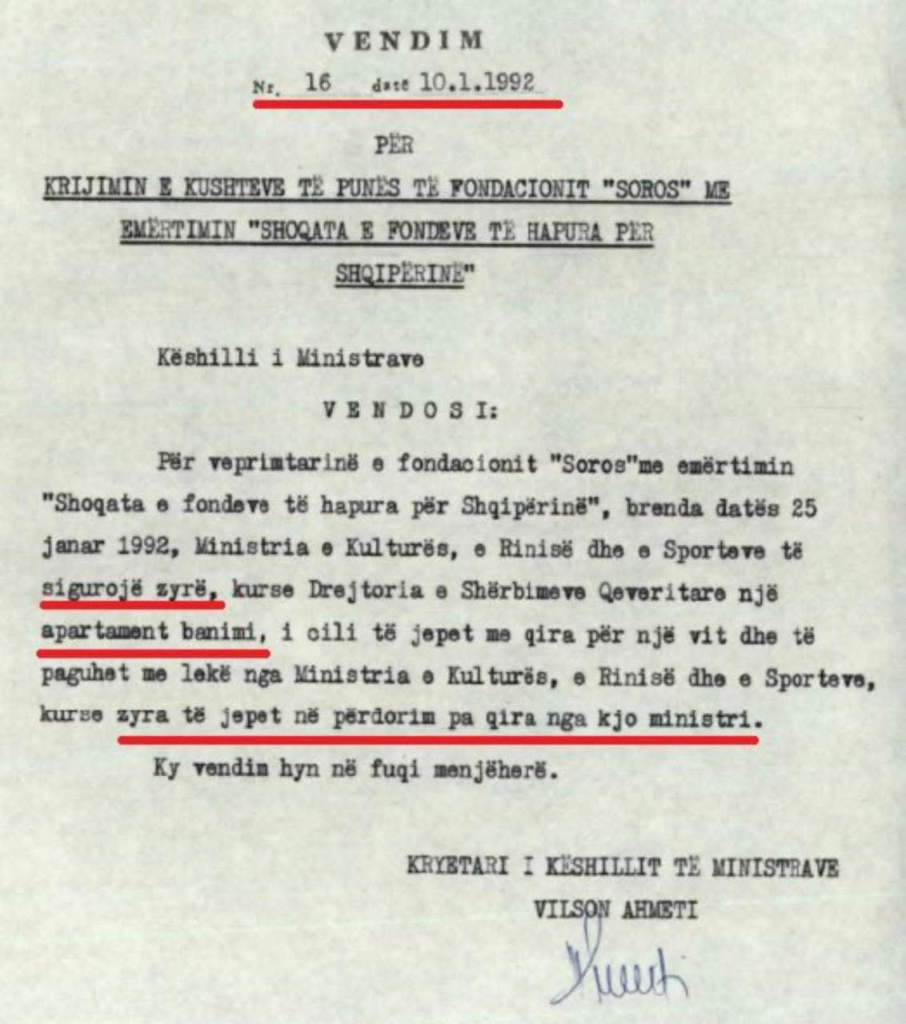 Ai publikon një vendim të Këshillit të Ministrave, të datës 10 janar 1992, sipas të cilit qeveria e asaj kohe i garantonte Fondacionit “Soros” zyra pa qira dhe një apartament banimi me qira të paguar nga shteti
