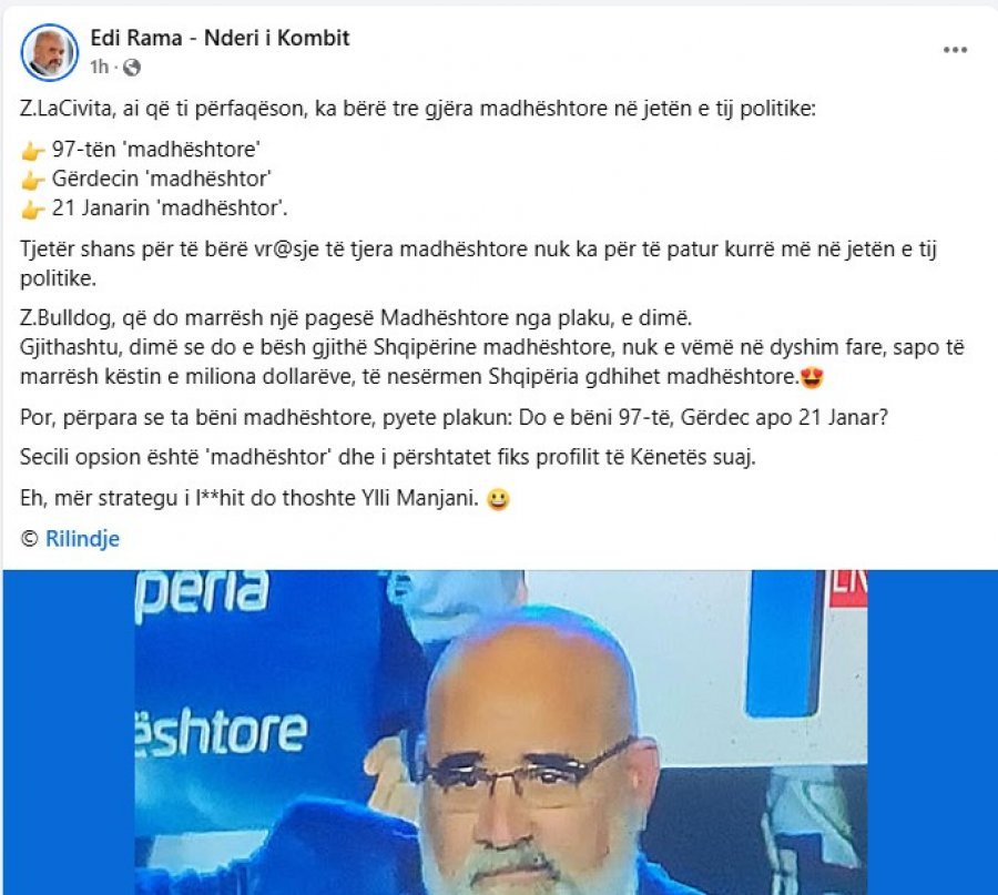 Në një postim – që është fshirë brenda pak minutash – Rama e quan Chris LaCivita ‘bulldog’. Syri po poston tekstin autentik të rigjeneruar dhe shpërndarë nga faqe të menaxhuara nga njerëz pranë Ramës që kanë nisur një fushatë denigruese, të turpshme kundër strategut të fitores së Donald Trump dhe njëkohësisht udhëheqësi i fushatës së Berishës.