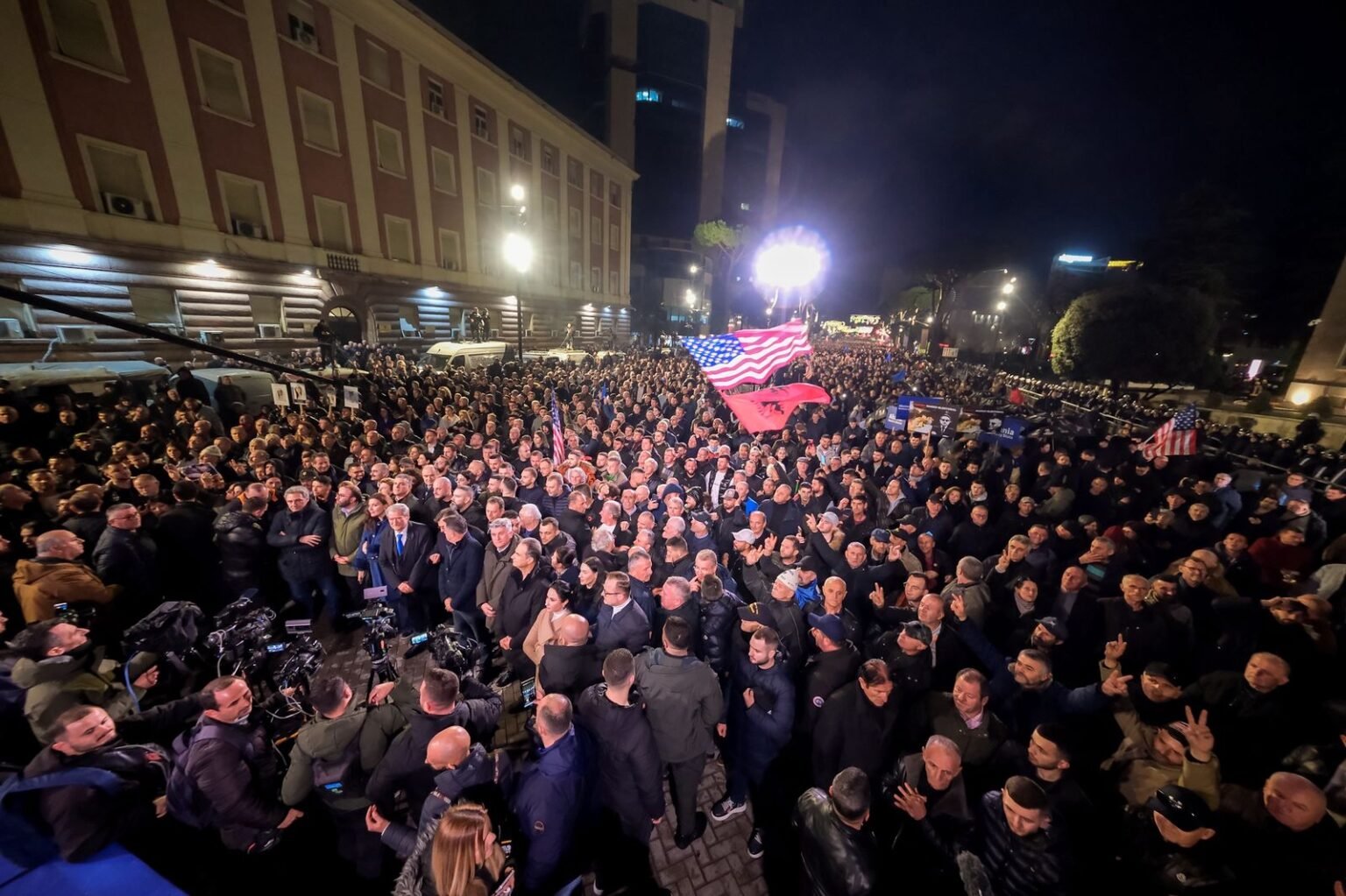 Mijëra mbështetës të Partisë Demokratike të opozitës brohoritën “Rama, ik” dhe “Rama në burg”, duke mbajtur flamuj shqiptarë dhe të partisë.