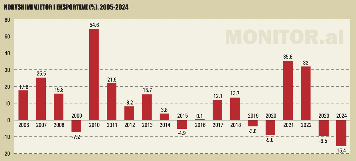 Në vitin 2024, eksportet në vend kanë shënuar rënien më të madhe të paktën që nga viti 2005, kur raportohen të dhënat më të hershme nga INSTAT.