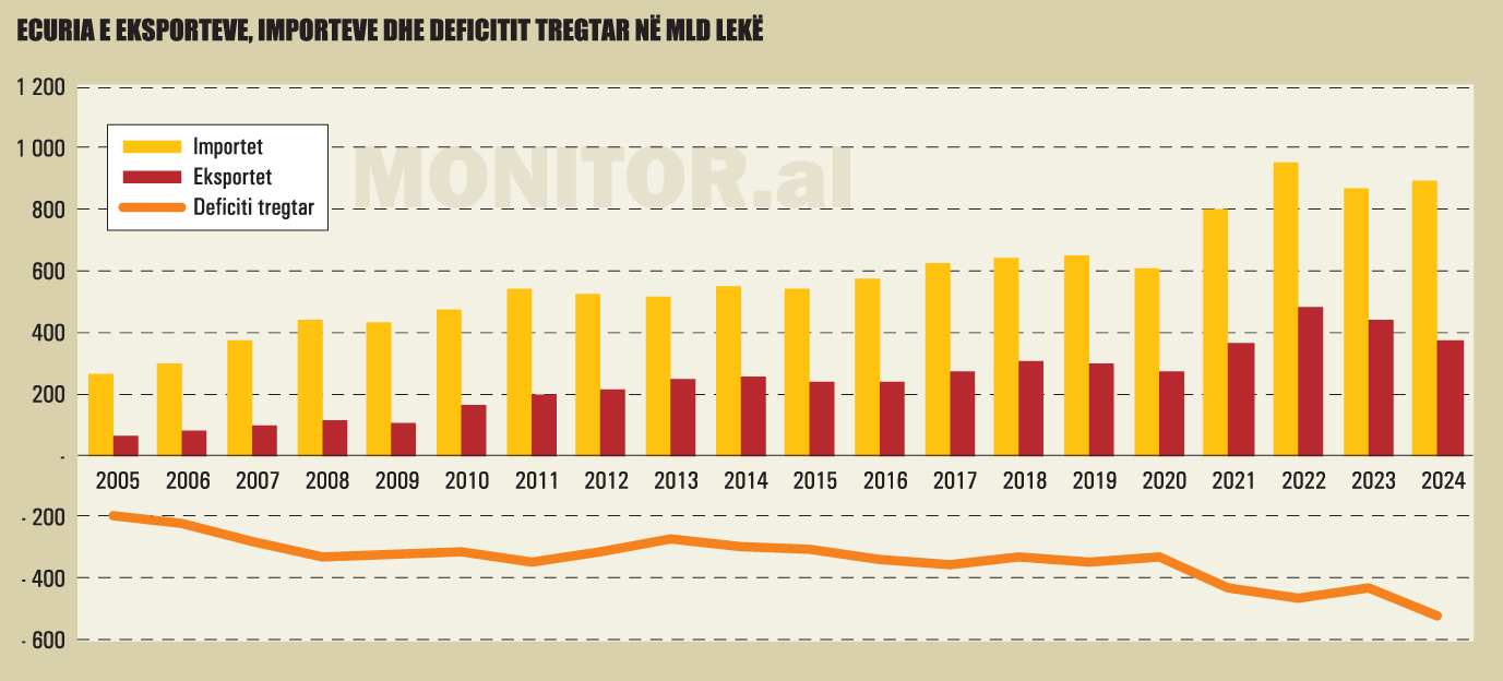 Deficiti tregtar i vendit arriti në 521,7 miliardë lekë, ose 5,2 miliardë euro në 2024, duke shënuar një rekord historik që kur mbahen të dhënat zyrtare, duke përfshirë vitet e tranzicionit, por edhe para kësaj periudhe.