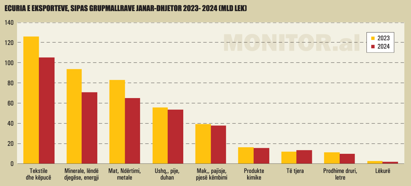 Sipas INSTAT, gjatë vitit 2024, eksportet e mallrave arritën vlerën 373 miliardë lekë, duke u ulur me 15,4%, krahasuar me një vit më parë. Grupet që kanë ndikuar negativisht në uljen vjetore të eksporteve, janë: “Minerale, lëndë djegëse, energji elektrike” me 5,3 pikë përqindje, “Tekstile dhe këpucë” me 4,8 pikë përqindje, “Materiale ndërtimi dhe metale” me 4,1 pikë përqindje.