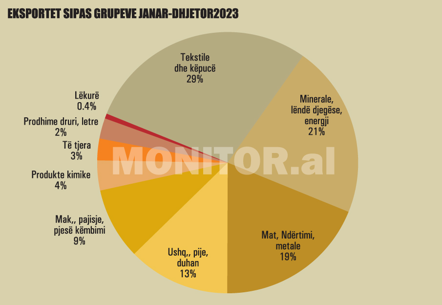 Në dhjetor, eksportet e tekstileve dhe këpucë, grupi më i madh eksportues në vend, ranë me 20%, nga 10.7% që ishte tkurrja për nëntorin. Për gjithë vitin, eksportet e tekstileve dhe këpucëve ishin 105 miliardë lekë, me tkurrje prej 17% me bazë vjetore.